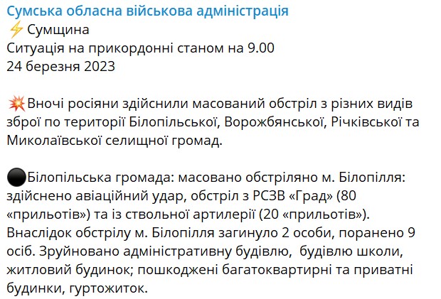 По данным Сумской военной администрации, Белополье обстреливали также из "Градов" (80 "прилетов") и из ствольной артиллерии.