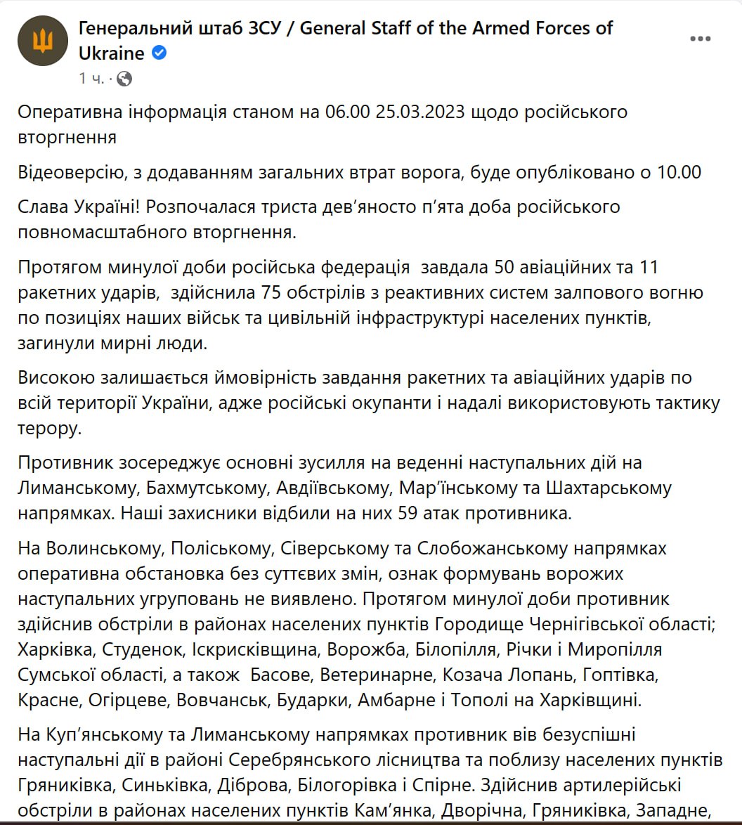 В субботу, 25 марта, в Украине идет уже 395-й день войны с РФ.