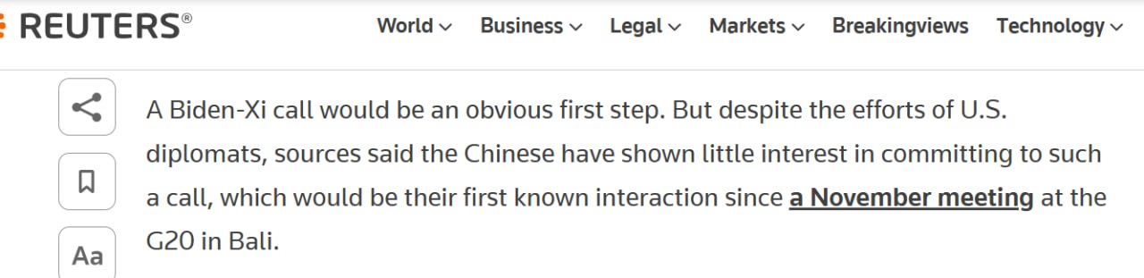 "Звонок Байден-Си был бы очевидным первым шагом. Но, несмотря на усилия американских дипломатов, источники сообщили, что китайцы не проявили особого интереса к такому призыву", - говорит источник агентства Reuters.