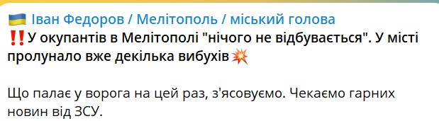 "У оккупантов в Мелитополе "ничего не происходит". В городе прозвучало уже несколько взрывов. Что пылает у врага на этот раз, выясняем. Ждем хороших новостей от ВСУ", - написал он в своем Telegram-канале.