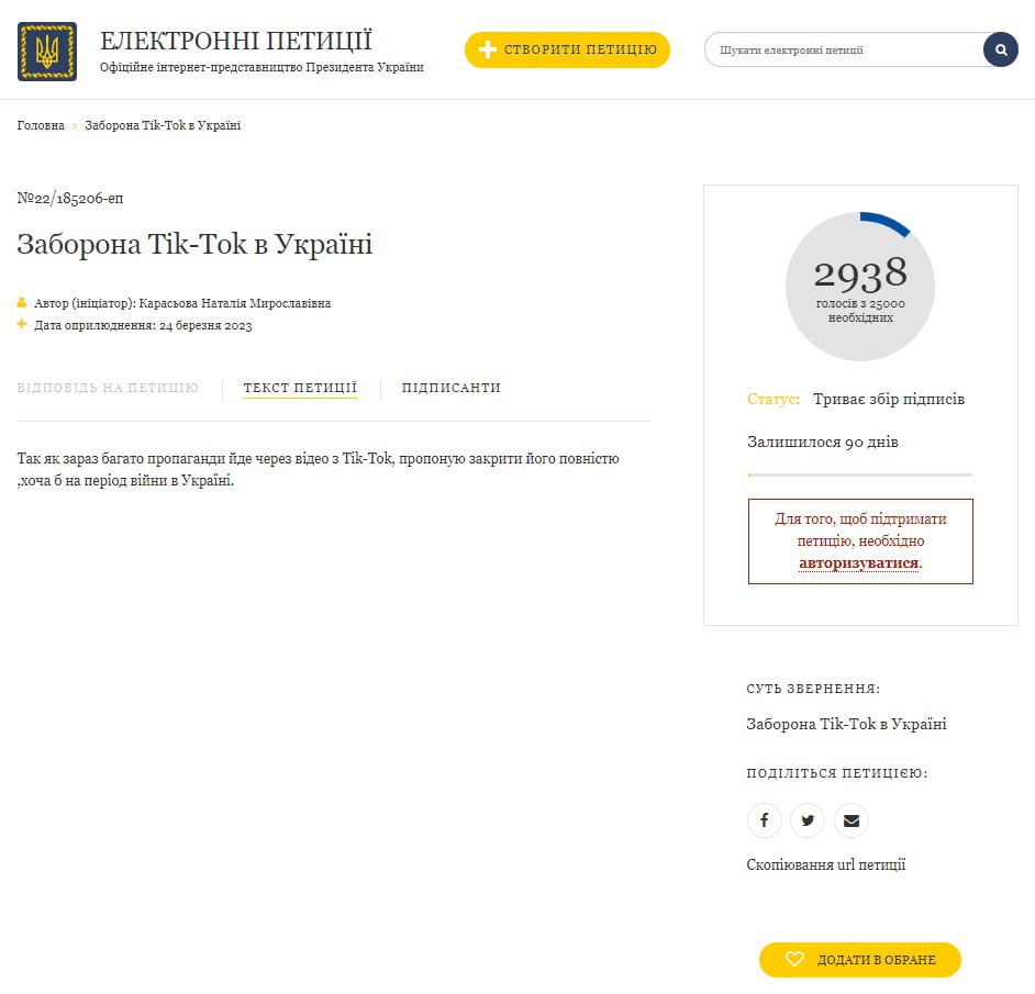 На сайте президента появилась петиция с призывом запретить TikTok на территории Украины.