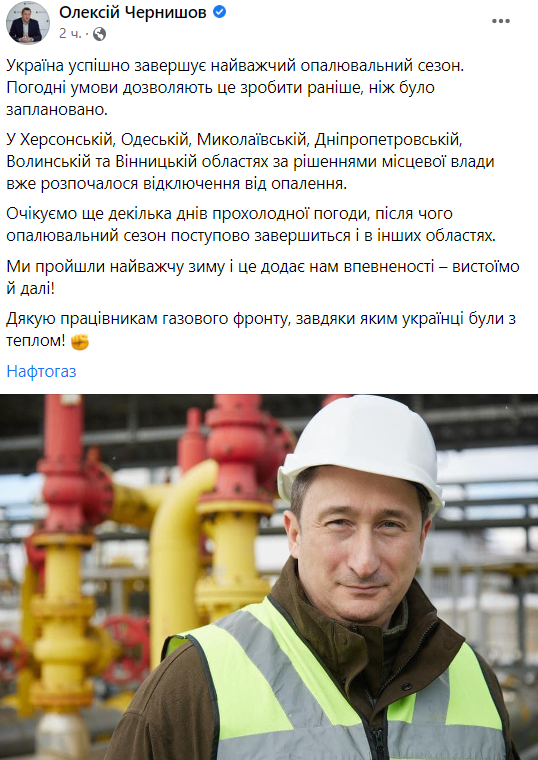 "Мы прошли самую тяжелую зиму, и это придает нам уверенность - выстоим и дальше! Спасибо работникам газового фронта, благодаря которым украинцы были с теплом!" - добавил глава НАК.
