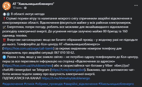 Как сообщает "Хмельницкоблэнерго", отключения фиксируются почти во всех районах электросетей. Причина - сильный ветер и налипание мокрого снега.
