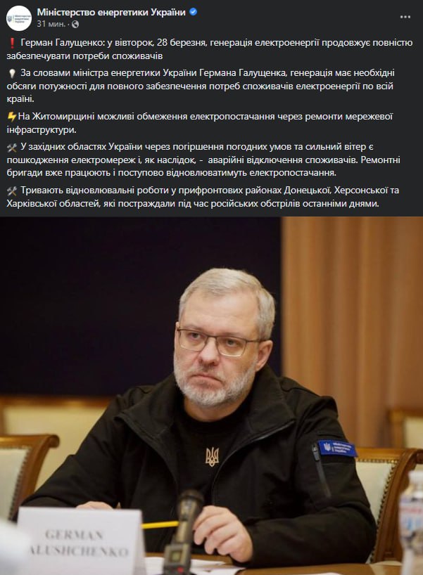 Министр энергетики Герман Галущенко заявил об ограничениях электроснабжения из-за ремонтных работ на Житомирщине.