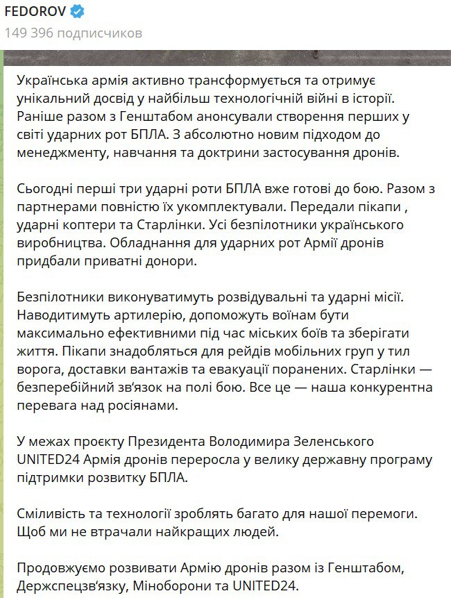 "Оборудование для ударных рот Армии дронов приобрели частные доноры. Беспилотники будет выполнять разведывательные и ударные миссии. Будут наводить артиллерию, помогут воинам быть максимально эффективными во время городских боев и спасать жизни. Пикапы понадобятся для рейдов мобильных групп в тыл врага, доставки грузов и эвакуации раненых", - сообщил Федоров.