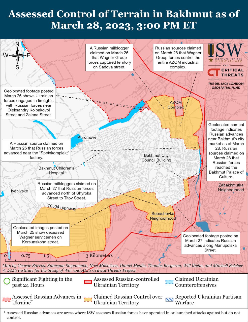 Также в Институте подтверждают заявления российских блогеров о том, что "Вагнер" продвинулся ближе к центру города - взял городской рынок и достиг Дворца культуры: "Эти утверждения правдоподобны, учитывая геолоцированные визуальные доказательства продвижения "Вагнера" к центру города, опубликованные 28 марта".