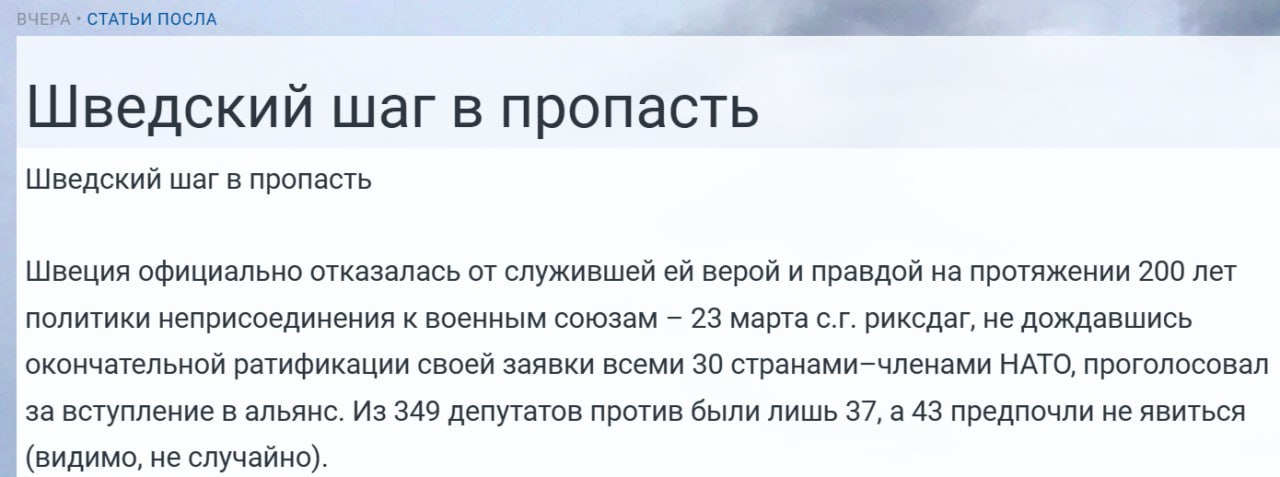 Посол России вчера опубликовал на сайте представительства статью "Шведский шаг в пропасть", где раскритиковал вступление страны в Альянс. И заявил, что "новые члены враждебного блока станут легитимной целью для ответных мер со стороны России, в том числе военного характера".