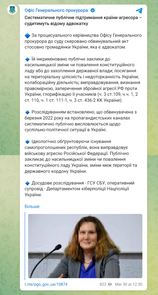 "Расследованием установлено, что обвиняемая с марта 2022 года на пропагандистских каналах систематически публично высказывается по общественно-политической ситуации в Украине", - говорится в сообщении.