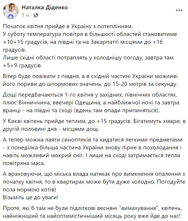 В Украине в субботу и воскресенье (1 и 2 апреля) ожидается потепление. В столице столбики термометров поднимутся до +15 градусов.