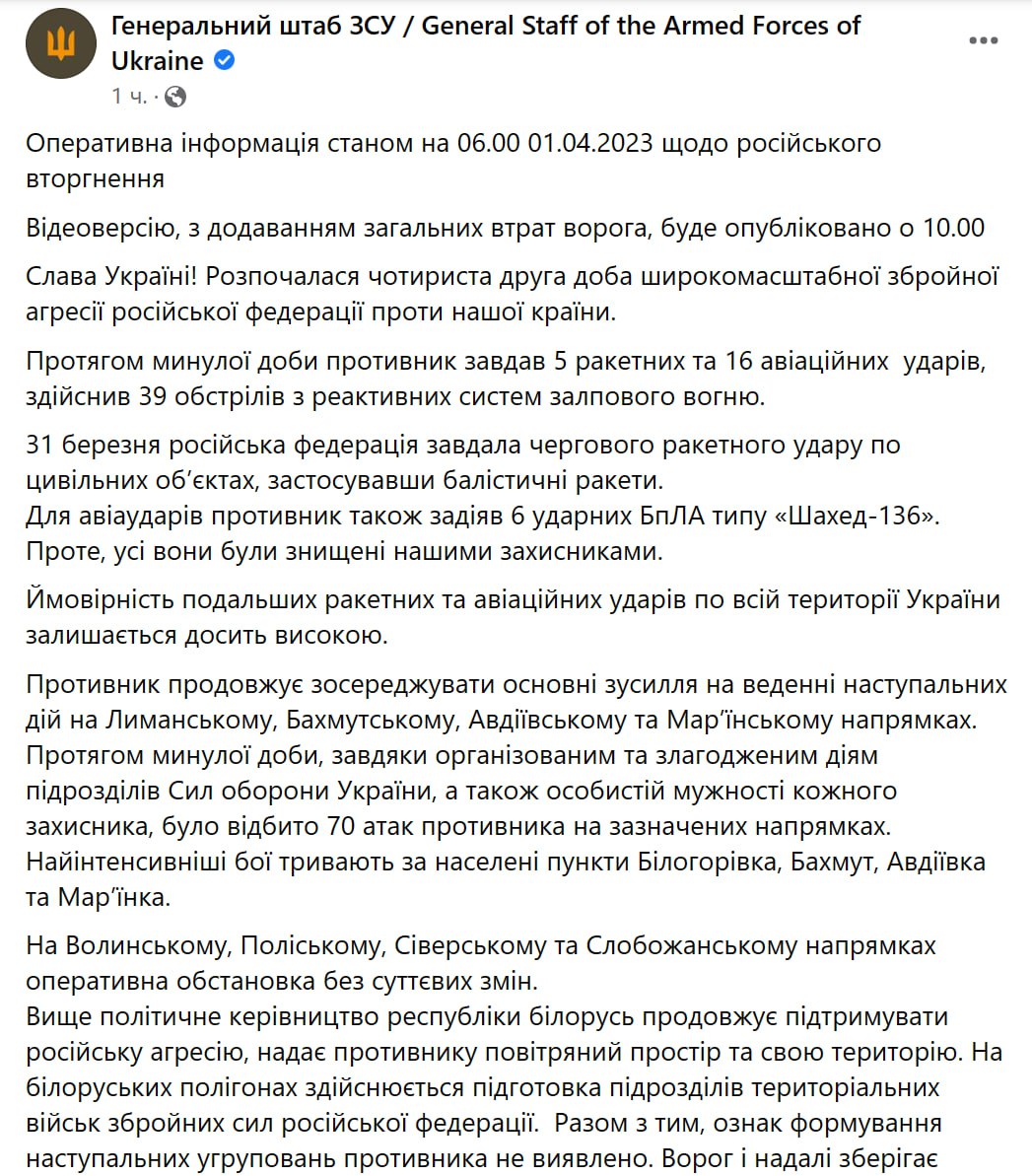 Генштаб ВСУ публикует сводку о военной ситуации на утро 1 апреля. За сутки было отражено 70 атак противника. Самые интенсивные бои продолжаются в населенных пунктах Белогоровка, Бахмут, Авдеевка и Марьинка.