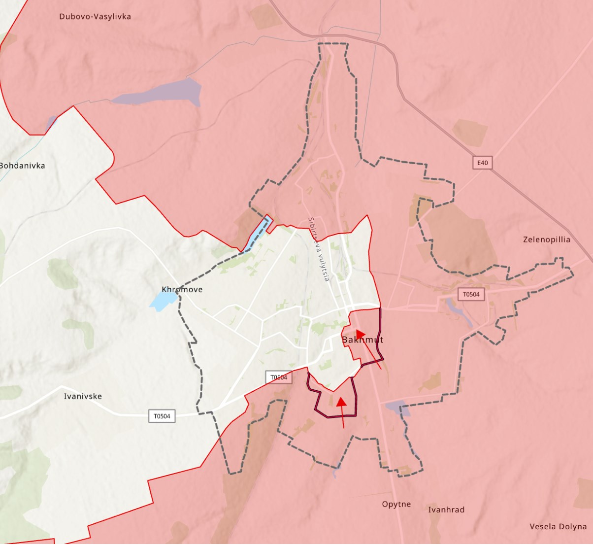Как указывает популярный военный обозреватель Warmapper "подразделения российской ЧВК "Вагнер" захватили здание горсовета, расположенное в центре города, двигаясь на север вдоль берега реки Бахмутовка. Украинские силы, возможно, частично отошли из других районов в центре города, чтобы не быть отрезанными".