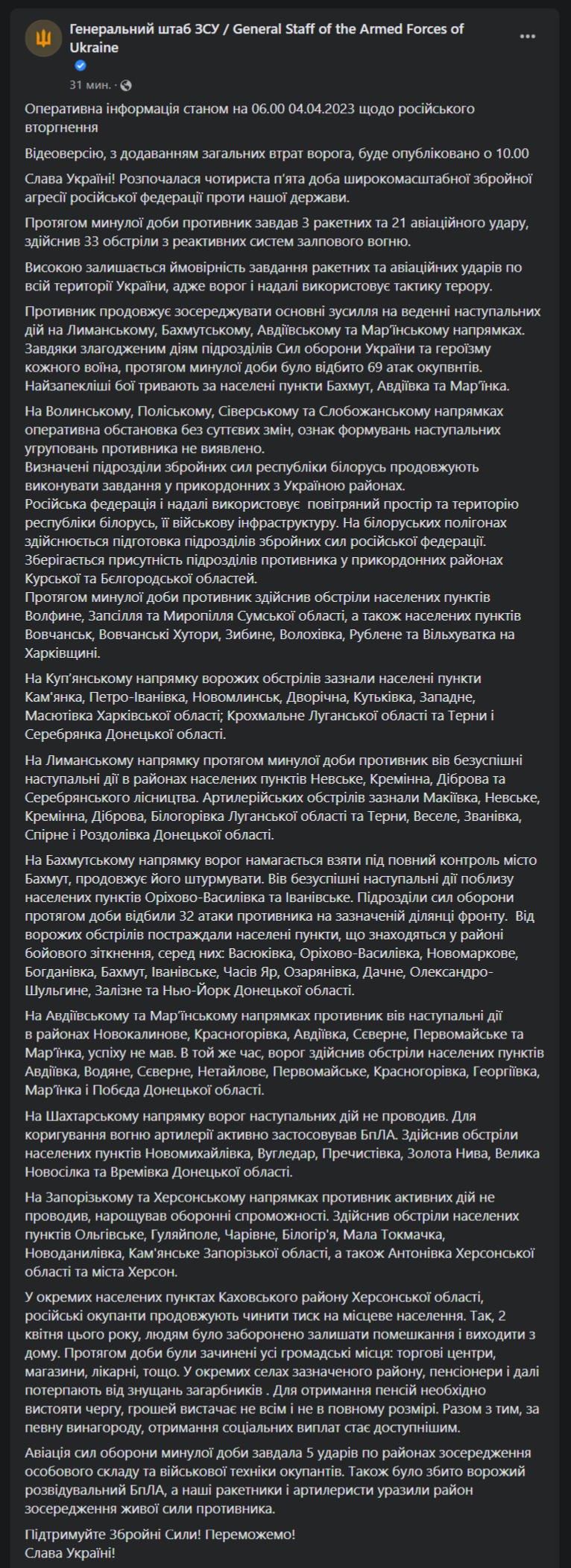 Во вторник, 4 апреля, в Украине идет уже 405-й день войны с РФ.