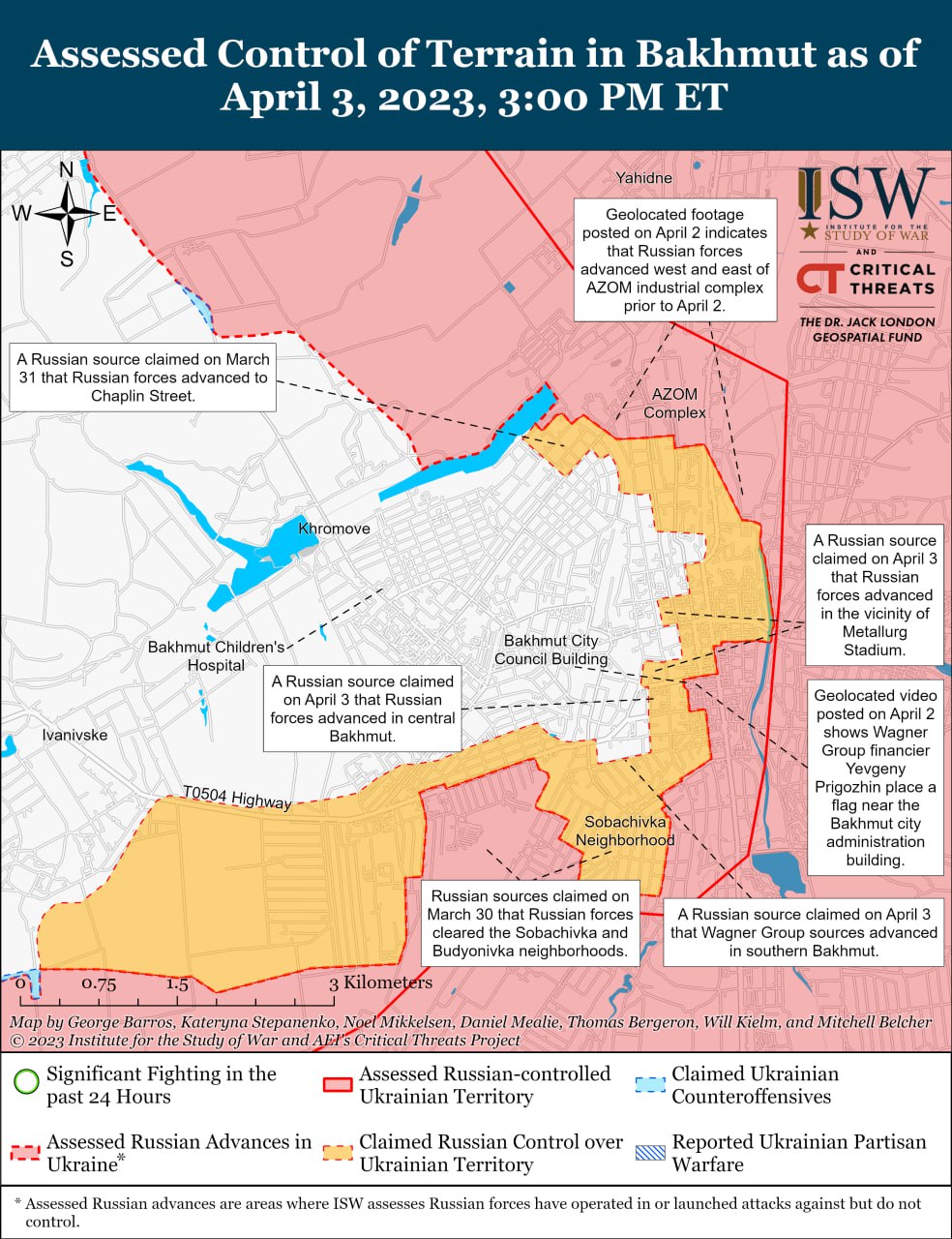 "Группа Вагнера, вероятно, продолжит попытки консолидировать контроль над центральным Бахмутом и попытается продвинуться на запад через плотные городские районы в направлении Хромово", - делают вывод эксперты.