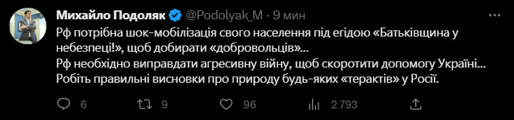 "РФ нужна шоковая мобилизация населения под лозунгом для вербовки добровольцев "Родина в опасности!". РФ нужно оправдать агрессивную войну, чтобы уменьшить помощь Украине. Делайте правильные выводы о характере любых "терактов" в России", - написал советник главы Офиса президента Михаил Подоляк в Twitter.