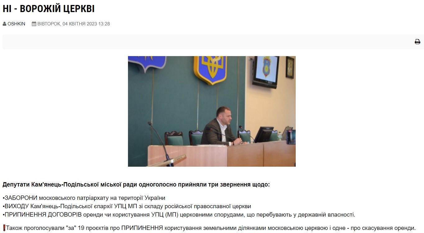 Депутаты горсовета Каменец-Подольского в Хмельницкой области разорвали все договоры с Украинской православной церковью (УПЦ) об аренде или пользовании церковными сооружениями, которые считаются государственной собственностью.