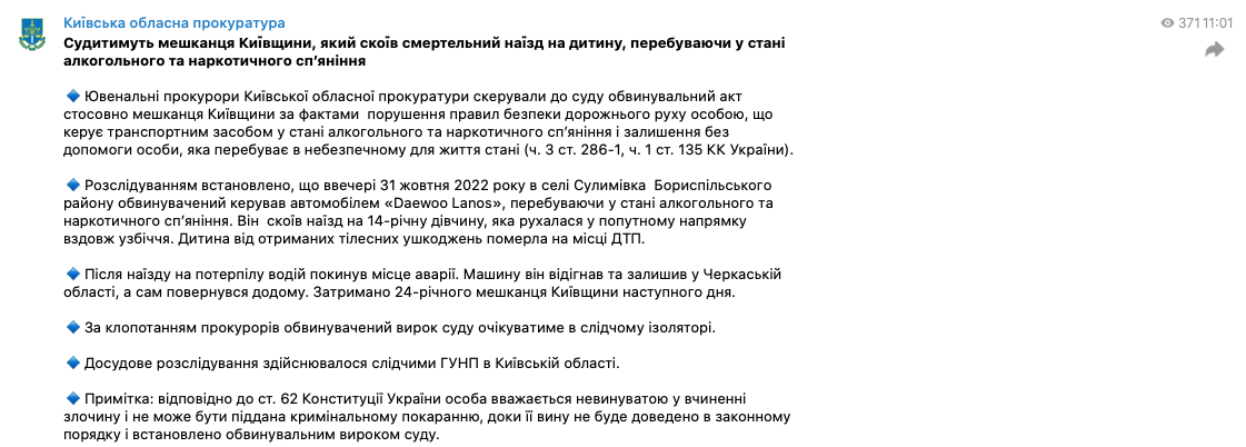 Прокуратура Киевской областной направила в суд обвинительный акт в отношении водителя, который в октябре прошлого года сбил насмерть ребенка, находясь в состоянии алкогольного и наркотического опьянения.