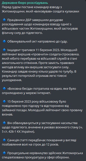 Его обвиняют в применении насилия в отношении подчиненного, совершенное в условиях военного положения. Командиру взвода грозит лишение свободы на срок до 12 лет.