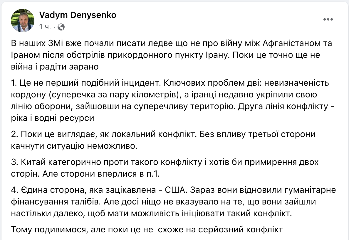 Руководитель "Украинского института будущего" Вадим Денисенко комментирует сообщения украинских СМИ о "чуть ли не о войне между Афганистаном и Ираном", которые появились после обстрелов пограничного пункта Ирана.