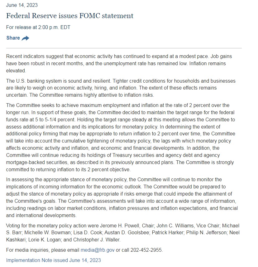 Федеральная резервная система (ФРС) США по итогам июньского заседания сохранила базовую процентную ставку на уровне 5-5,25% годовых.