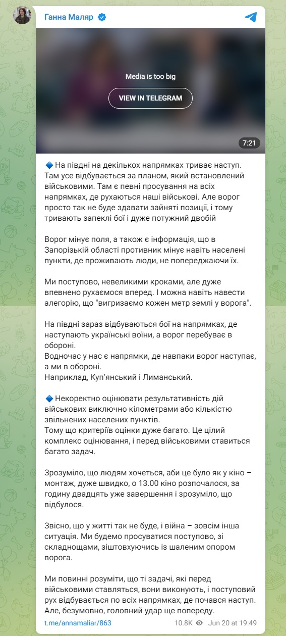 Маляр рассказала о ситуации на фронте. Фото: Телеграм