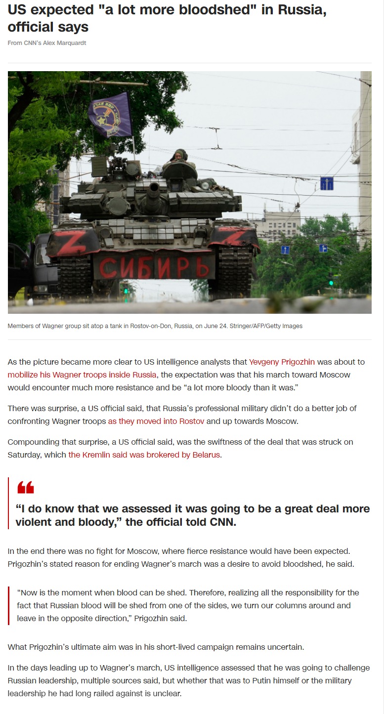 По мере того как аналитикам американской разведки становилось все более очевидно, что Евгений Пригожин собирался мобилизовать свои силы из ЧВК для мятежа в России, они ожидали, что его марш на Москву встретит гораздо более сильное сопротивление и прольется намного больше крови, чем в итоге пролилось.