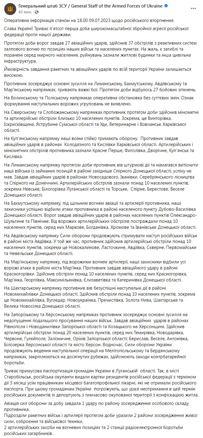 Генштаб ВСУ опубликовал оперативную информацию о российском вторжении по состоянию на 18:00 9 июля.