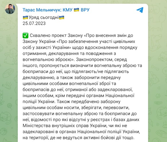 "Одобрен проект закона "О внесении изменений в закон Украины "Об обеспечении участия гражданских лиц в защите Украины" об усовершенствовании порядка получения, декларирования и обращения с огнестрельным оружием". Законопроектом, среди прочего, предлагается определить огнестрельное оружие и подлежащие/не подлежащие декларированию боеприпасы к нему, а также запретить передачу гражданскими лицами огнестрельного оружия и боеприпасов к нему, полученному или задекларированному, другим лицам, кроме передачи органам Национальной полиции Украины. Также предусмотрено запрещение гражданским лицам носить, хранить, перевозить, применять огнестрельное оружие и боеприпасы к нему, сведения о которых отсутствуют в реестрах и базах данных Министерства внутренних дел Украины или которые не задекларированы в органах Национальной полиции Украины, на территории, где не ведутся активные боевые действия", - сказано в посте Мельничука.