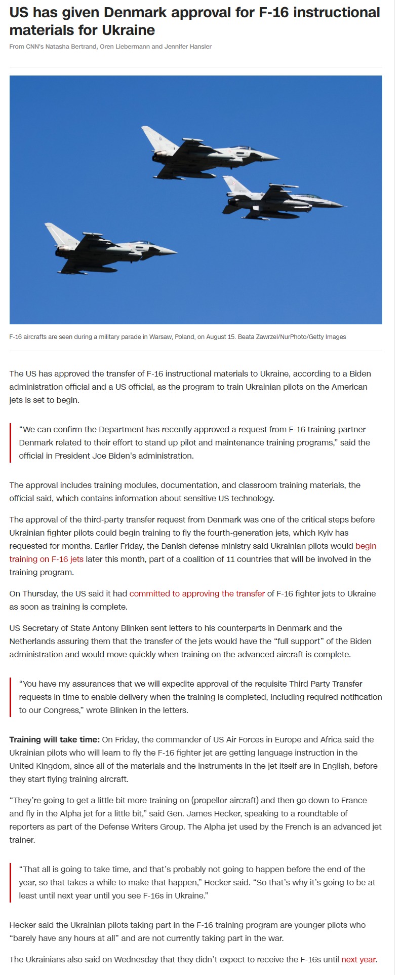 "Можем подтвердить, что Министерство обороны недавно одобрило запрос от страны-партнера по обучению на F-16, Дании, связанный с их усилиями по созданию программ подготовки пилотов и технического обслуживания", – сказал один из чиновников.