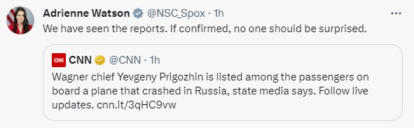 Белый дом ознакомился с сообщениями прессы о крушении самолета под Тверью в России, на борту которого, предположительно, находился бизнесмен Евгений Пригожин. В администрации США не удивится, если гибель куратора ЧВК "Вагнер" подтвердится.