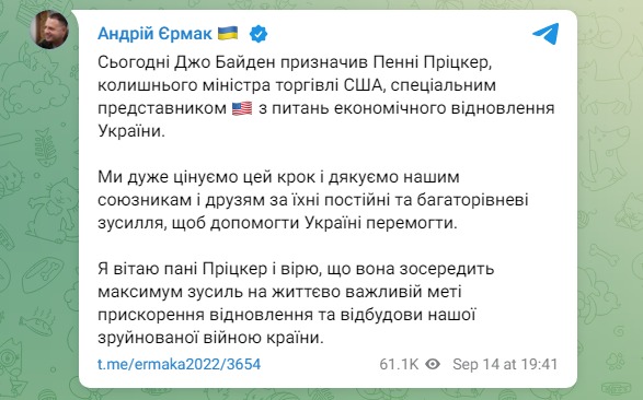 Вчера Джо Байден назначил бывшего министра торговли США Пенни Прицкер специальным представителем Вашингтона по экономическому восстановлению Украины.