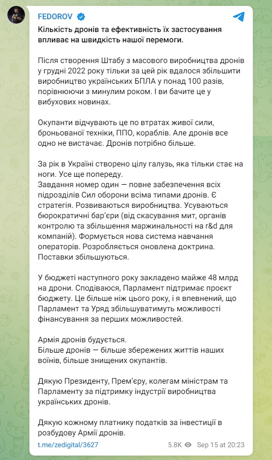 Федоров добавил, что после создания штаба по массовому производству дронов в декабре 2022 года только за этот год удалось увеличить производство украинских БПЛА более чем в 100 раз по сравнению с прошлым годом. Это отразилось на потерях противника в живой силе, бронированной технике, ПВО, кораблях. Но дронов все равно не хватает.