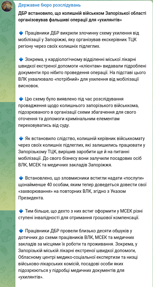 ГБР установило, что бывший военком Запорожской области организовывал фальшивые операции для уклонистов.