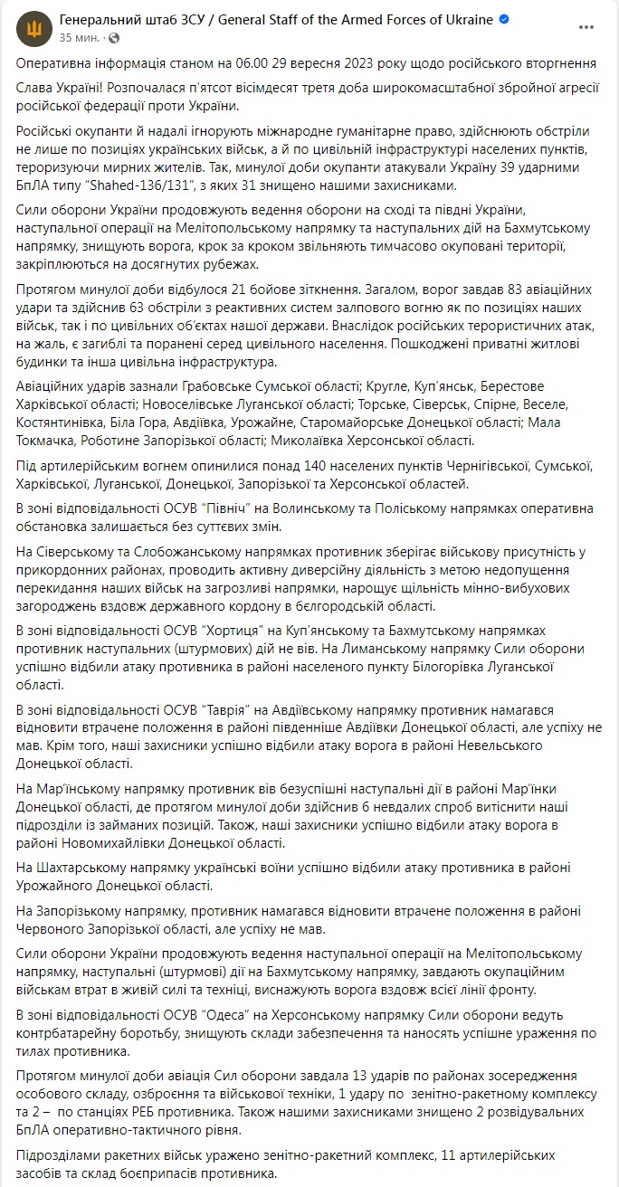Сводка Генштаба ВСУ по состоянию на 18:00 29 сентября 2023 года