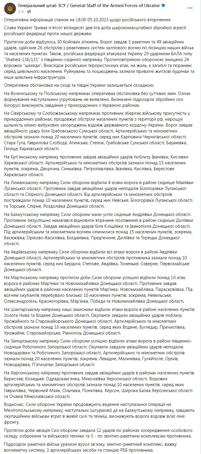 В четверг, 5 октября, в Украине идет 589-й день войны с Россией.