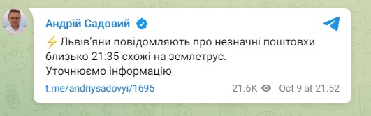 "Львовяне сообщают о незначительных толчках около 21:35, похожих на землетрясение. Уточняем информацию", – сообщил Садовый.