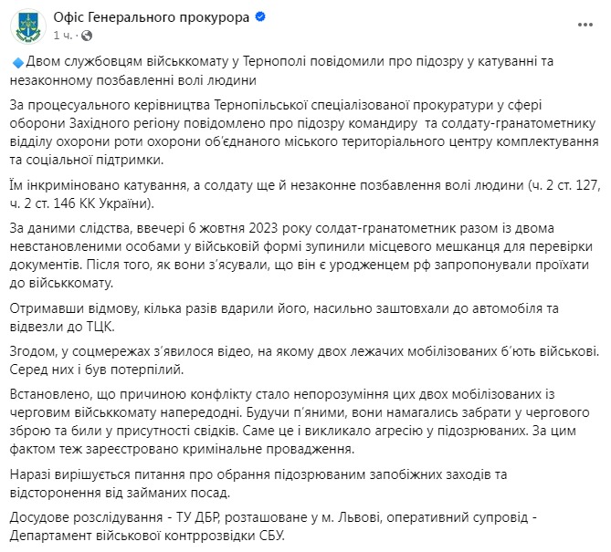 "Им инкриминированы пытки, а солдату еще и незаконное лишение свободы человека (ч. 2 ст. 127, ч. 2 ст. 146 УК Украины)", - сказано в посте.