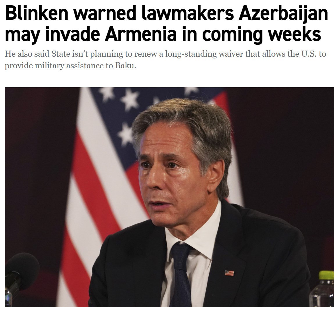 "Штаты видят возможность вторжения Азербайджана на юг Армении в ближайшие недели", - передает издание слова Блинкена.