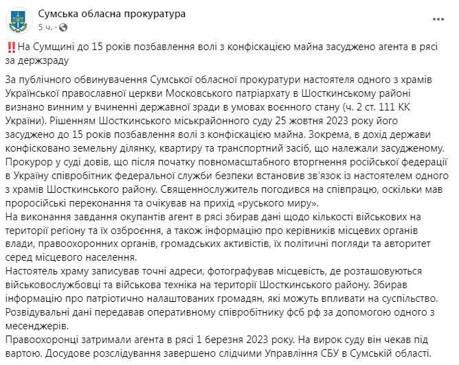 Ждал прихода русского мира. Священника УПЦ в Сумской области посадили на 15 лет за государственную измену