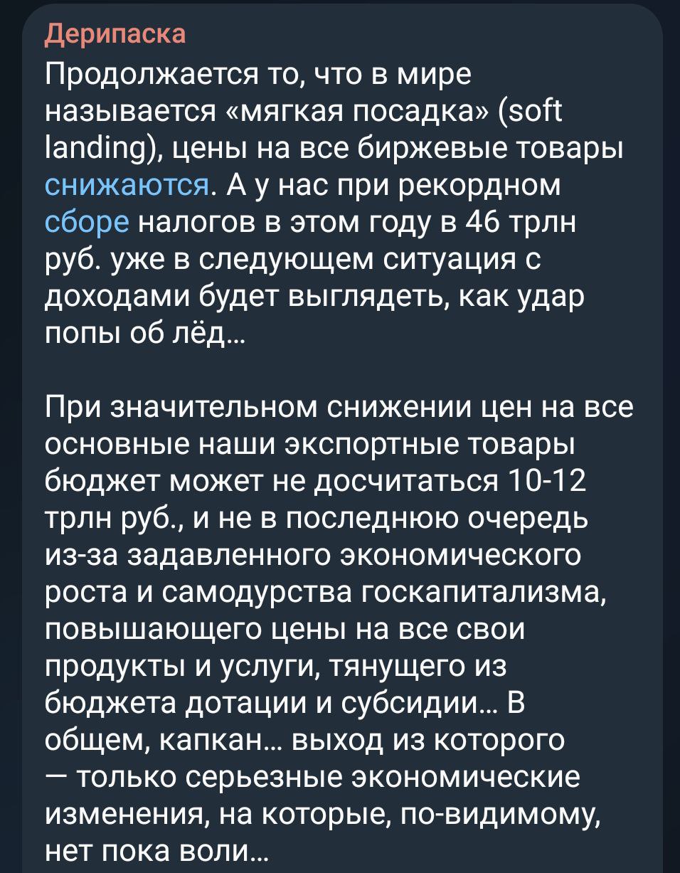 "Продолжается то, что в мире называется "мягкая посадка" (soft landing), цены на все биржевые товары снижаются. А у нас при рекордном сборе налогов в этом году в 46 трлн руб. уже в следующем ситуация с доходами будет выглядеть как удар попы об лед. При значительном снижении цен на все основные наши экспортные товары бюджет может не досчитаться 10-12 трлн рублей", - прогнозирует Дерипаска.