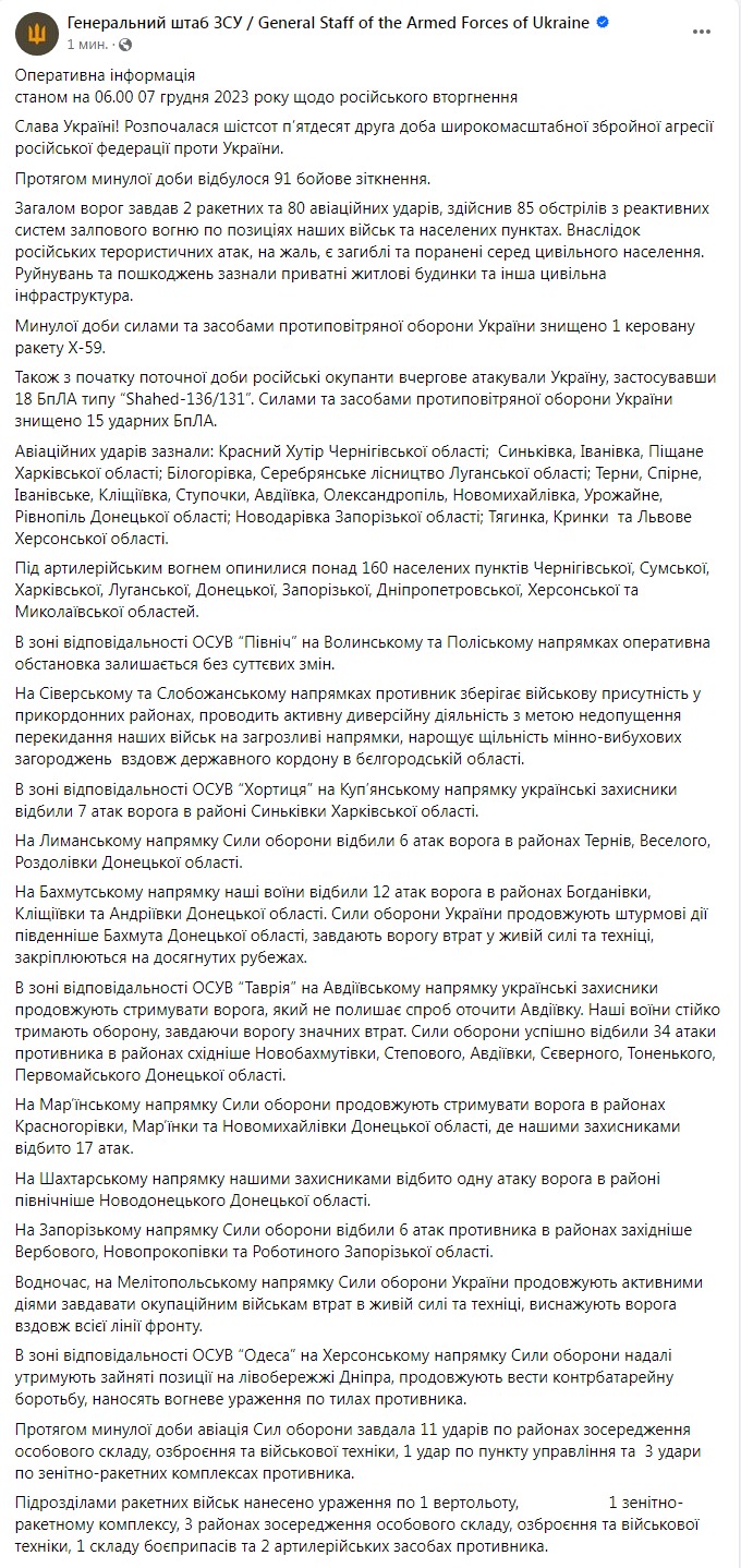 Вечерняя сводка Генштаба ВСУ 7 декабря 2023 года