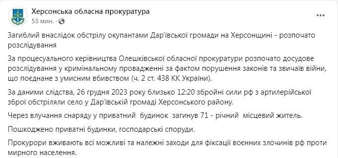 По данным следствия, сегодня около 12:20 вооруженные силы России из артиллерийского оружия обстреляли село в Дарьевской общине, и вследствие попадания снаряда в частный дом погиб 71-летний местный житель. Также были повреждены другие частные дома и хозяйственные постройки.