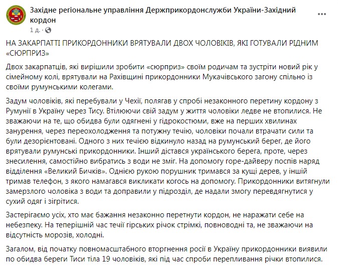 Пограничники Мукачевского отряда Госпогранслужбы совместно со своими румынскими коллегами вытащили из реки Тисы двух выбившихся из сил мужчин, одетых в гидрокостюмы. Задержанными оказались двое местных жителей, которые решили "сделать сюрприз", неожиданно появившись дома для празднования Нового года в семейном кругу.