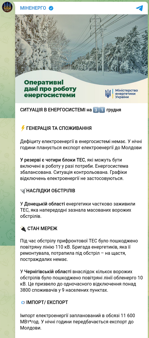 По состоянию на 31 декабря в Украине нет дефицита электричества. В ночь на 1 января 2024 года планируется экспорт электроэнергии в Молдову.