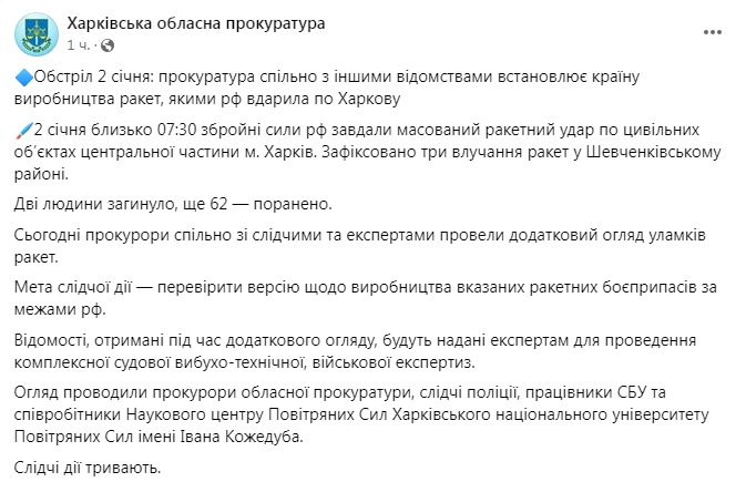 Между тем Харьковская областная прокуратура заявила, что 2 января РФ могла ударить по Харькову северокорейскими баллистическими ракетами.
