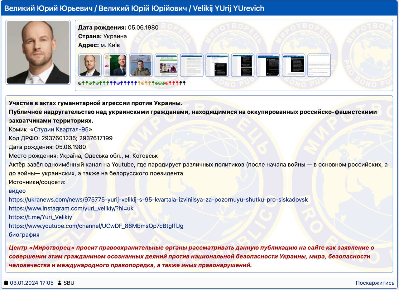 В базу данных "Миротворца" Юрий Великий внесен с такими формулировками: