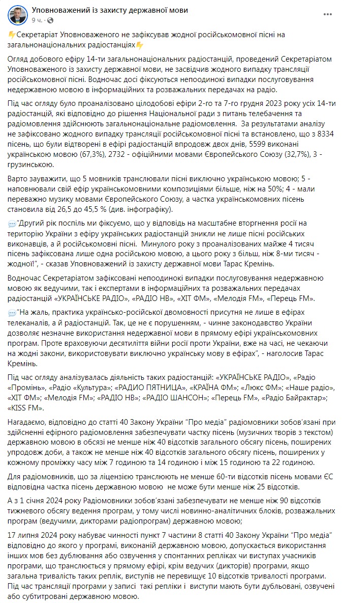 Об этом сообщается в Фейсбуке мовного омбудсмена Тараса Креминя со ссылкой на обзор суточного эфира 14 общенациональных радиостанций.