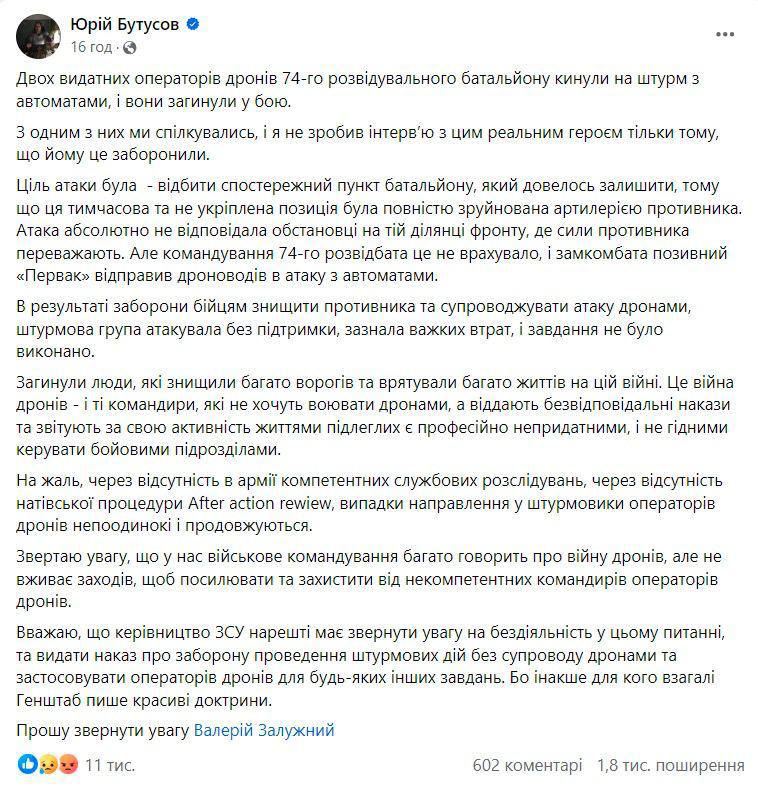 "В результате запрета бойцам уничтожить противника и сопровождать атаку дронами, штурмовая группа атаковала без поддержки, понесла тяжелые потери, и задача не была выполнена", - пишет Бутусов.