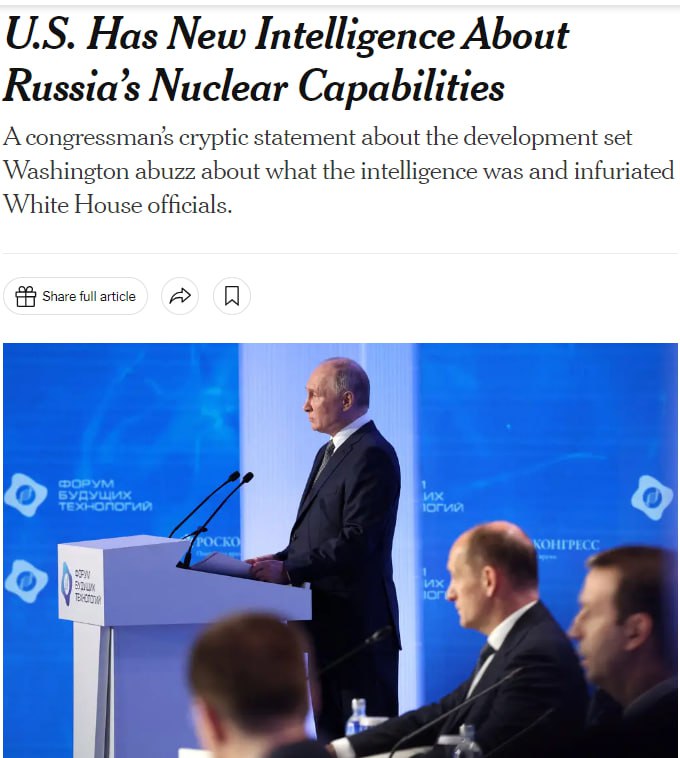 Ссылаясь на официальных лиц, проинформированных по этому вопросу, издание сообщило, что Соединенные Штаты проинформировали Конгресс и своих союзников в Европе о новых разведданных о российском ядерном потенциале, который может представлять международную угрозу.