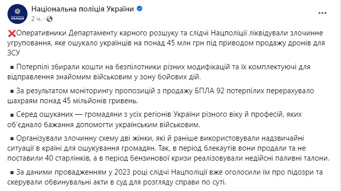 Оперативники Департамента уголовного розыска и следователи Нацполиции ликвидировали преступную группировку, которая обманула украинцев более чем на 45 миллионов гривен под предлогом продажи дронов для ВСУ.