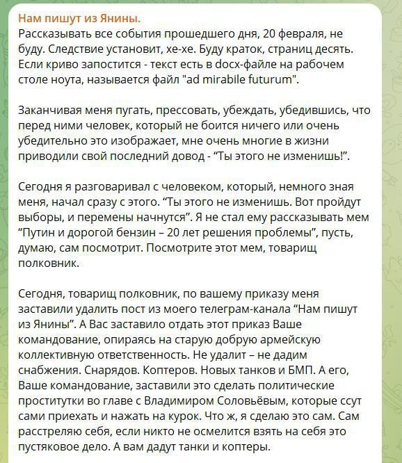 Морозов говорит, что некий "товарищ полковник" заставил его удалить пост по приказу командования.